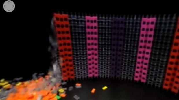 De esta manera, la grabación de YouTube permite ver cómo la pared de piezas de dominó se cae gradualmente alrededor del espectador: pilares color rosa, rojo, amarillo, verde, naranja, púrpura y azul se derrumban ante nuestra vista.